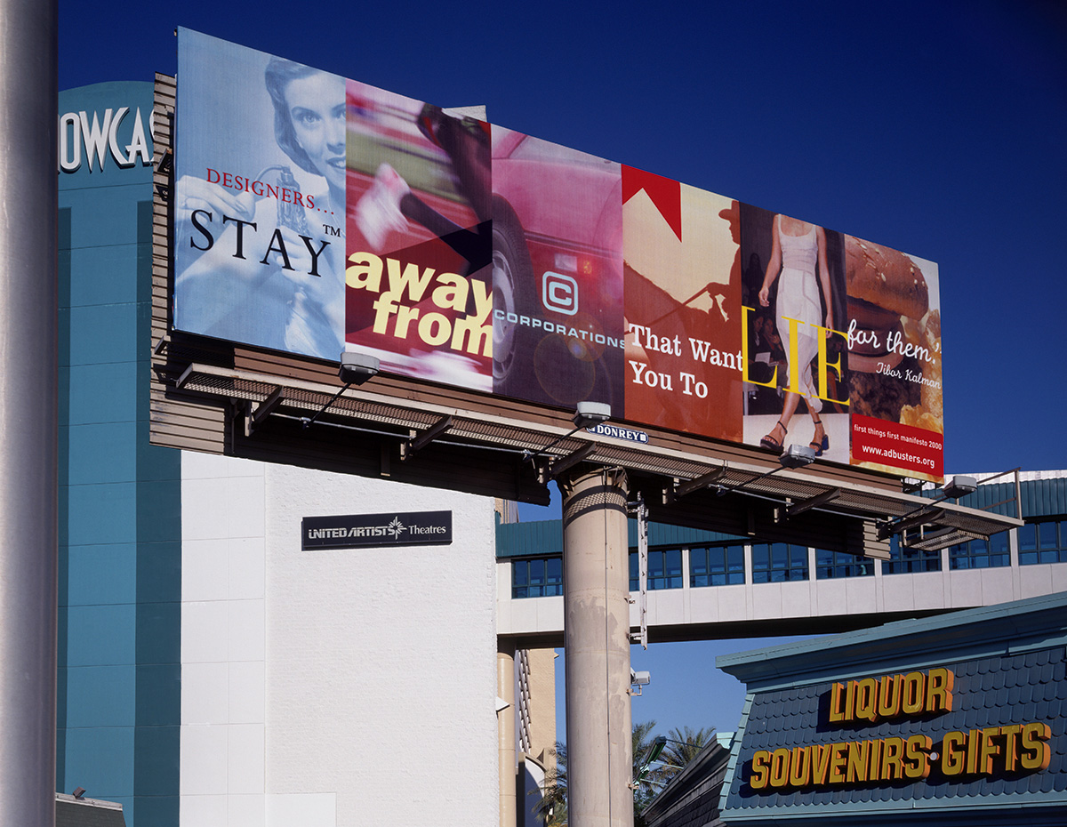 Barnbrook’s use of expressive design to highlight major socio-cultural issues is part of an ongoing movement of designers using their skillsets for more than corporate benefit. He was one of the early designers who was conscious of issues like environmental destruction for corporate benefits, and he wasn’t afraid to give a middle finger to these brands through his work (remember the Vegas billboard?). He lead the reissue of the First Things First manifesto in 2000 (the original was 1964) while working at Canadian non-profit publication Adbusters, as part of his mission to create more social awareness of over consumption through design, and got 33 leading visual communicators to sign on (Emigre, n.d.).