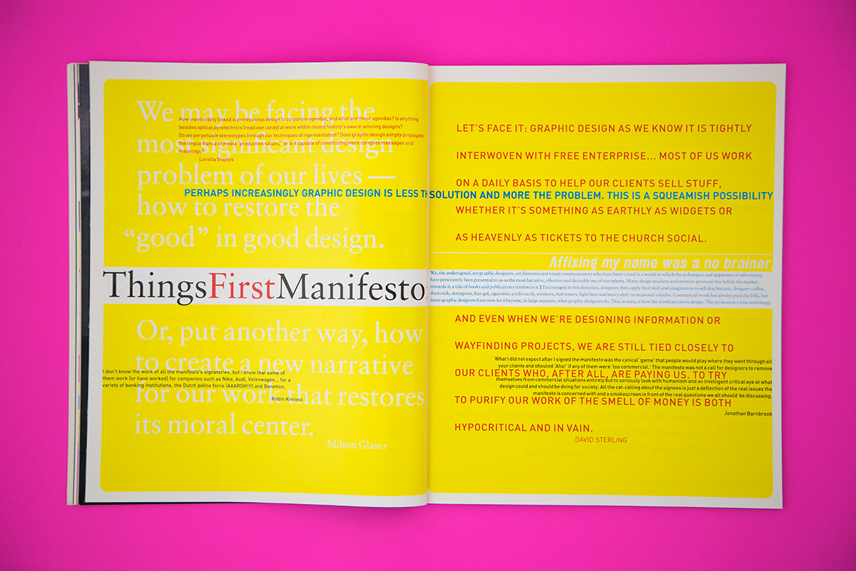 Your eye immediately gets pulled to the “Things First Manifesto” (the ‘First’ first is on the page before it) due to the large size and perceived white space around it. It’s not actually white space but the contrast between the white text on yellow is so poor it may as well be. The red colour of the word “first” makes it read as First Things First Manifesto, as my eye read that word right away and then again in the correct sequence. It uses an Old Style type for this phrase, giving it more authority and formality than all the other type in the layout which is mostly sans-serif. It feels important, like the heading of a significant legal document.
